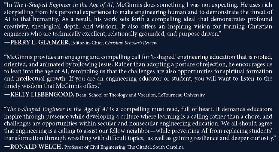 For Ron (who wrote: “The t-Shaped Engineer in the Age of AI is a compelling must read, full of heart. It demands educators inspire through presence while developing a culture where learning is a calling rather than a chore…”) Your hiring me into academia changed my life – the example you set, the mentorship you provided, the wisdom you dispense still. When readers of this Substack read the book, you’ll meet Ron in more detail – know also that the call to genuine relationship and mentorship, and to live out the life of the t-shaped engineer found in the book? It has found an embodiment in my friend and mentor Ron.