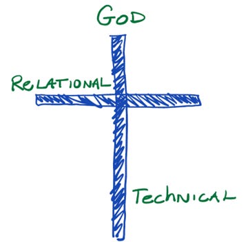 The lower vertical represents a technical foundation. The horizontal cross piece recasts professional or soft skills into relational ones that help us connect with other people. And the upper vertical points toward God, centering Him as our ultimate purpose.